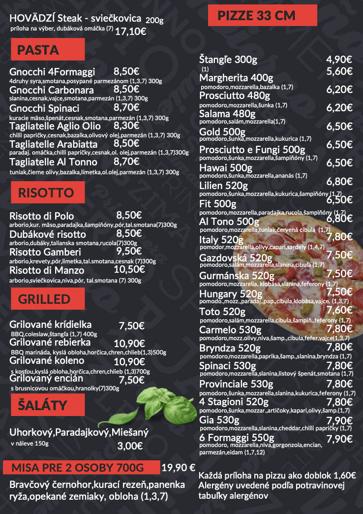 Originálne receptúry pravého talianska so štipkou maďarských chuťoviek a samozrejme slovenskej klasiky.